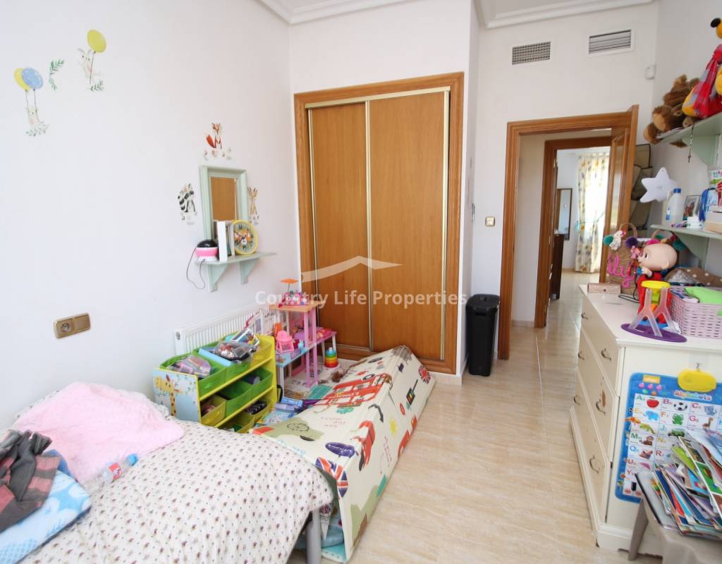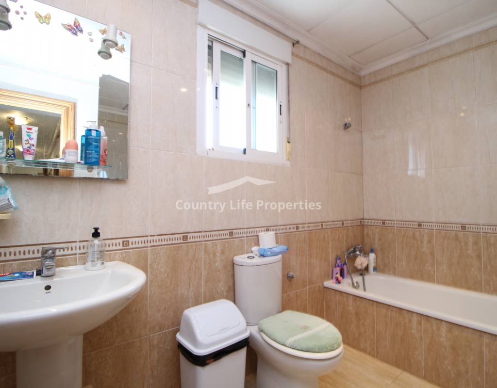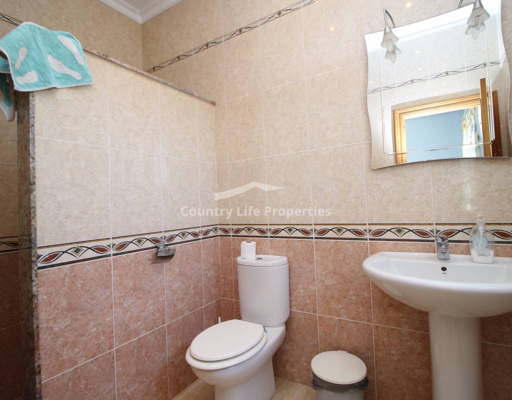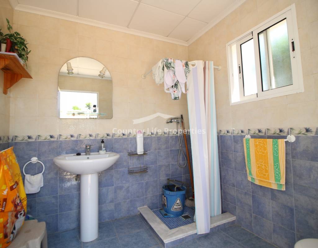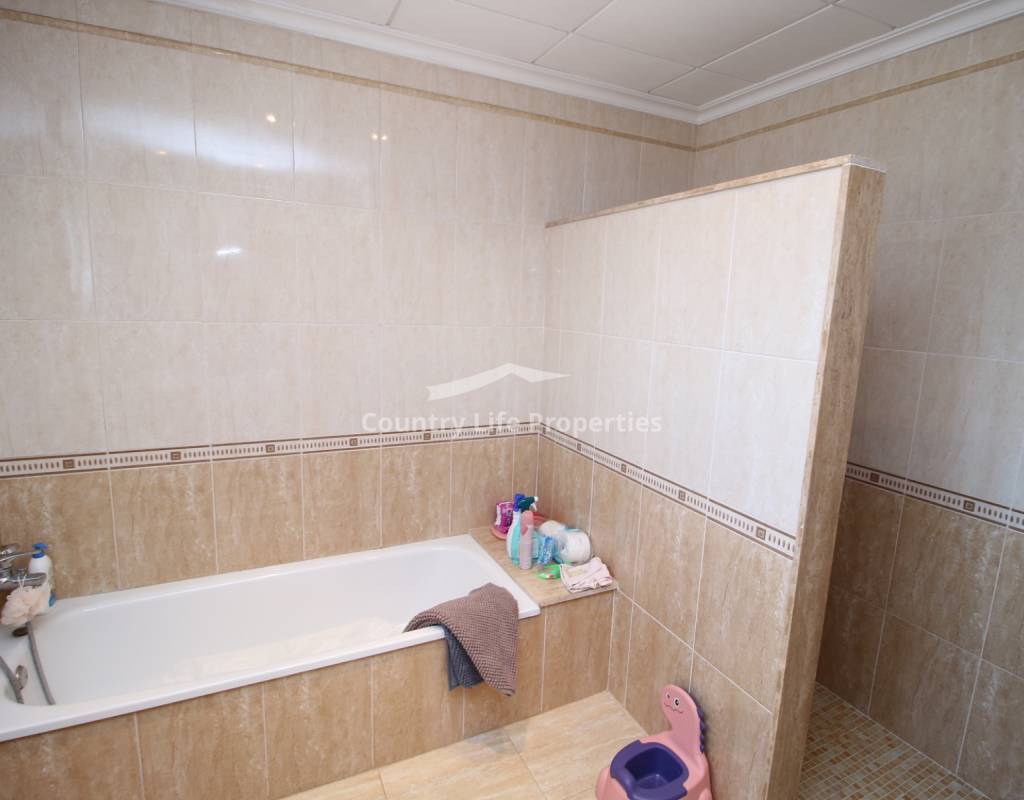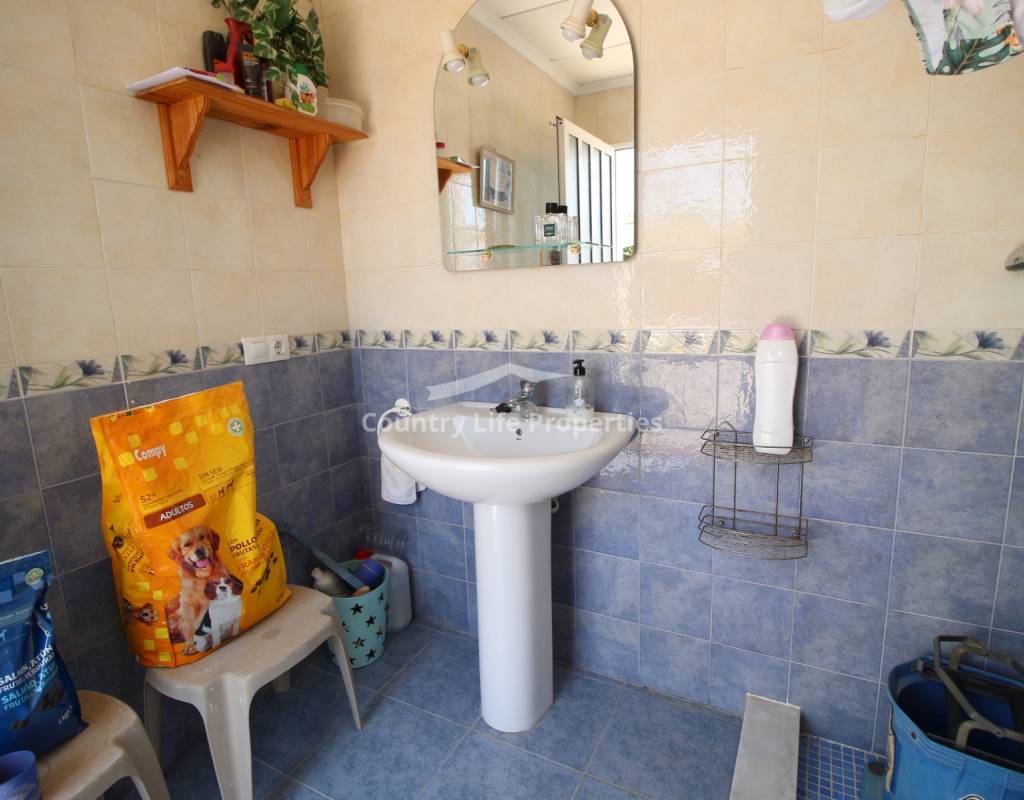 La propriété comprend quatre chambres spacieuses, toutes équipées de placards intégrés, ainsi que trois salles de bains, dont une à l'extérieur — idéale pour les réunions estivales ou les journées autour de la piscine. La salle de bains familiale est fonctionnelle et bien aménagée pour un usage quotidien.