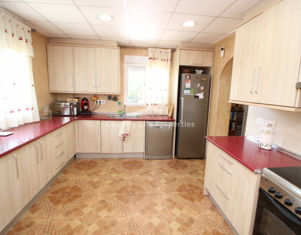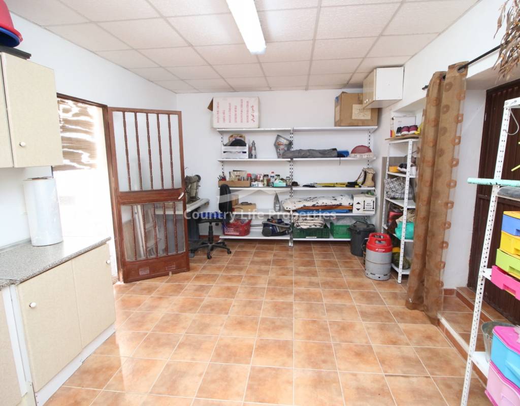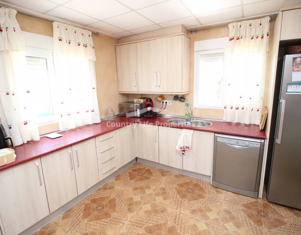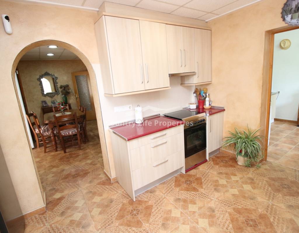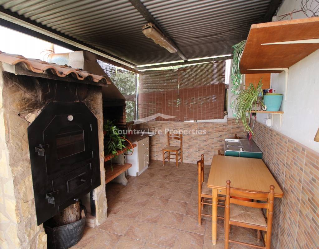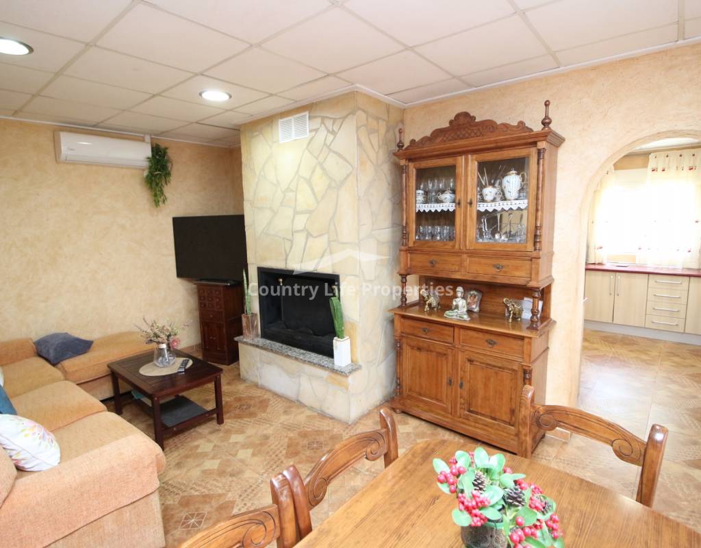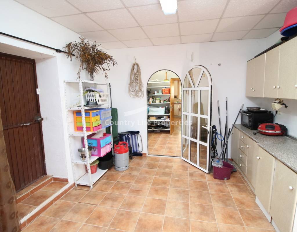 À l'intérieur, un séjour lumineux avec cheminée est relié à la cuisine par une arche. Une cuisine indépendante de bonne taille mène à une grande buanderie et espace de rangement, qui s'ouvre ensuite sur le patio et l'ancien poulailler désormais transformé en deux débarras.