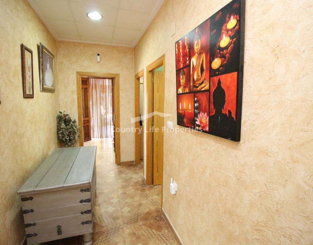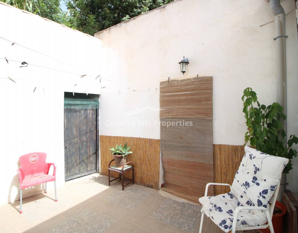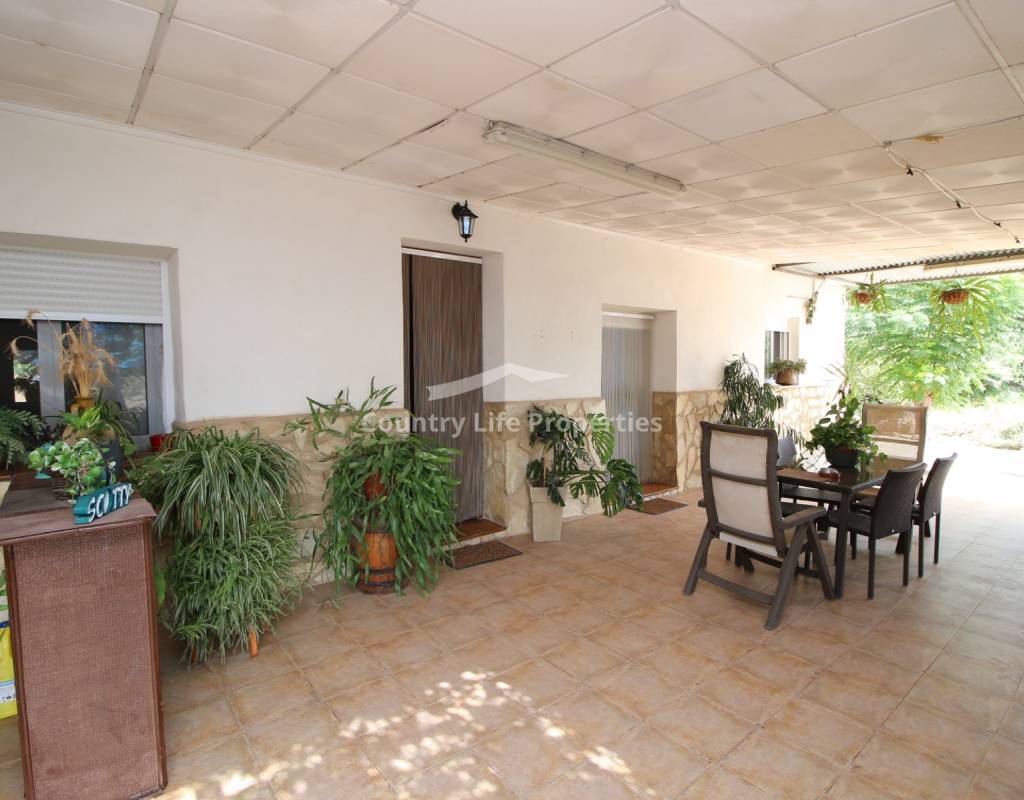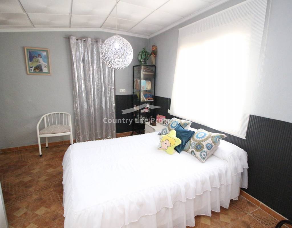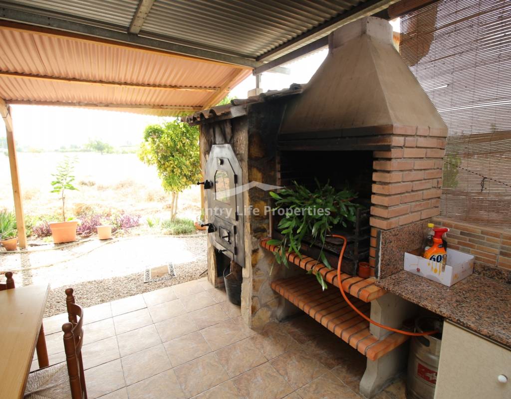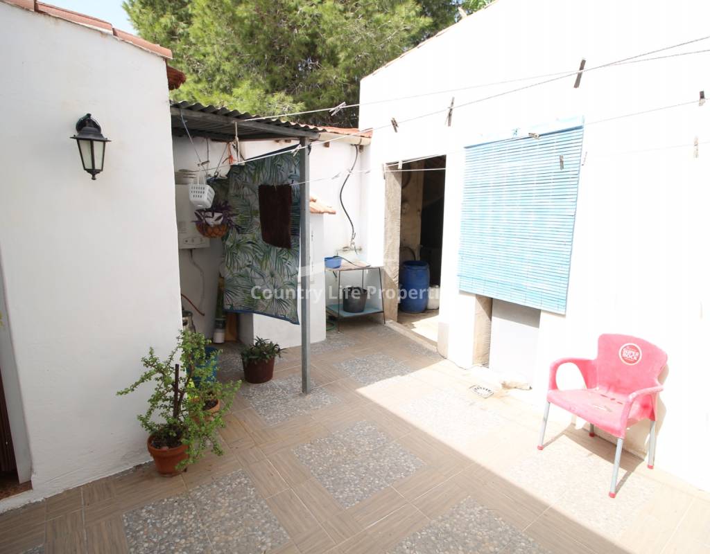 À l'intérieur, un séjour lumineux avec cheminée est relié à la cuisine par une arche. Une cuisine indépendante de bonne taille mène à une grande buanderie et espace de rangement, qui s'ouvre ensuite sur le patio et l'ancien poulailler désormais transformé en deux débarras.