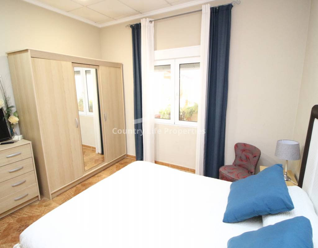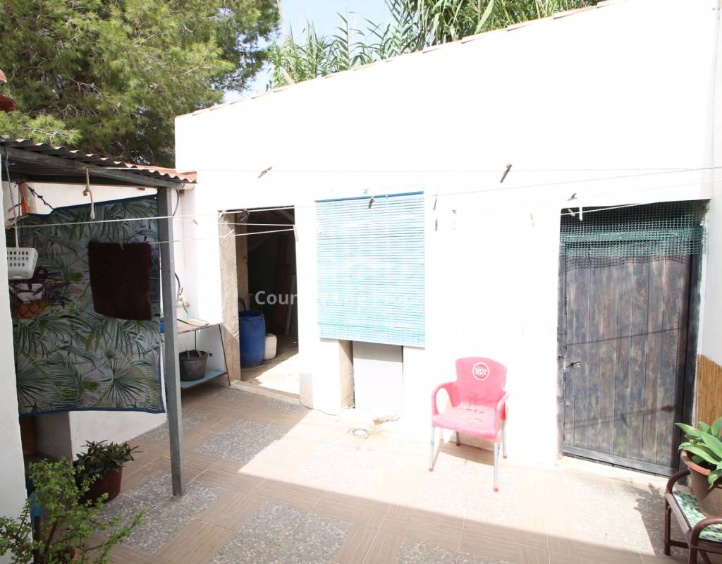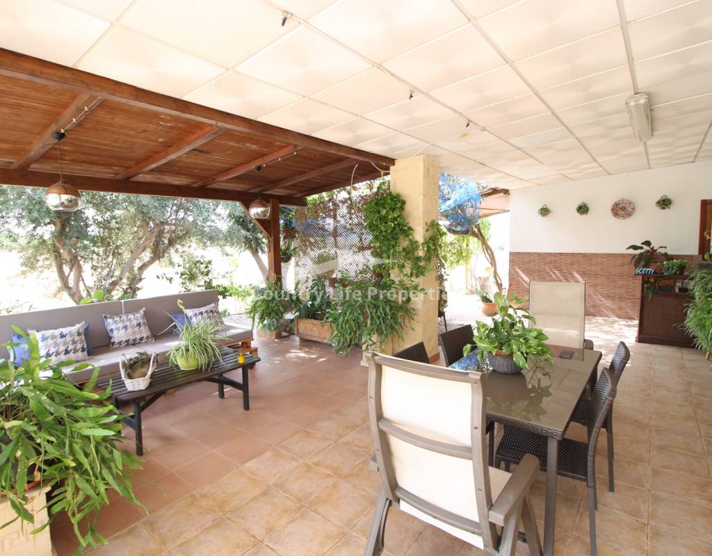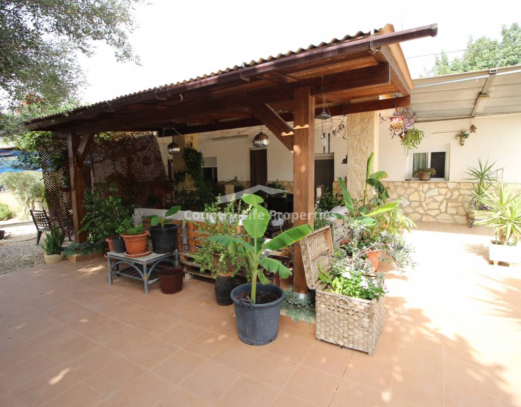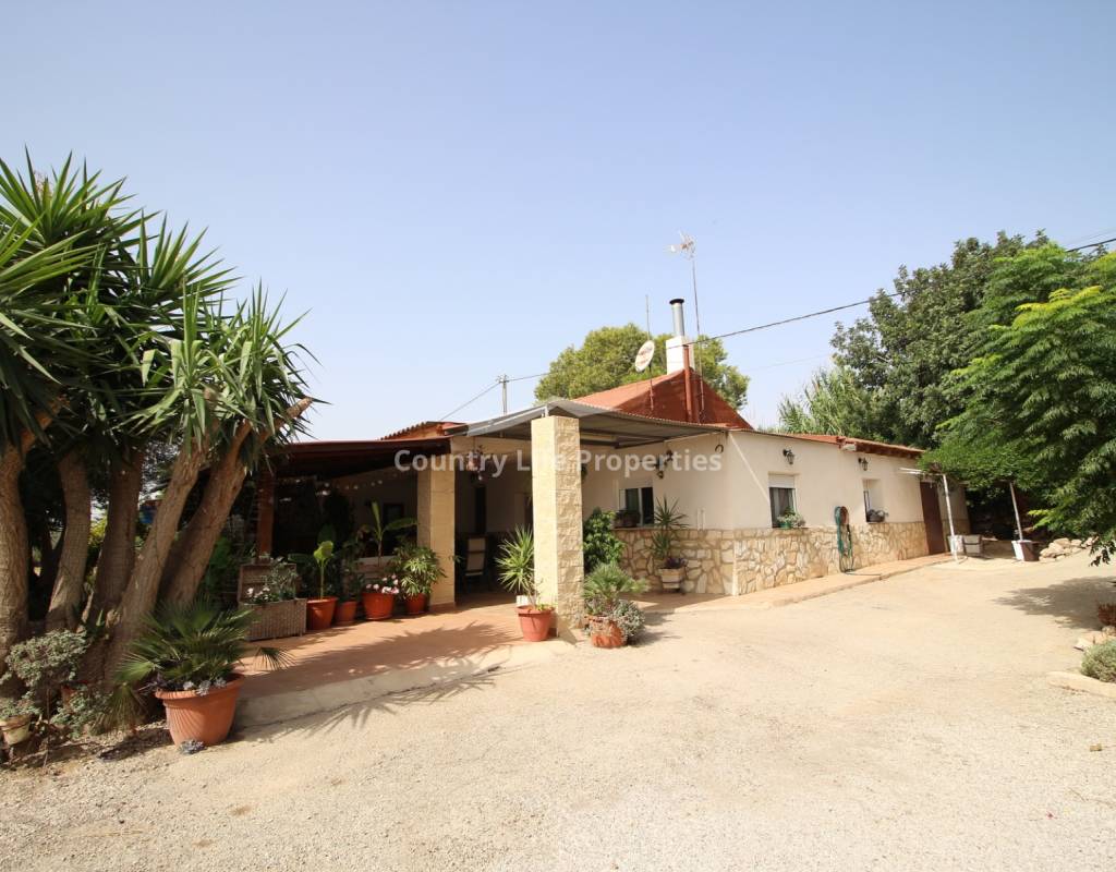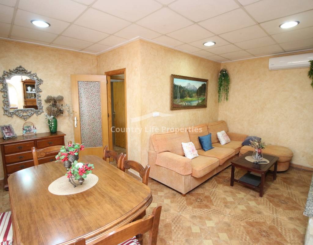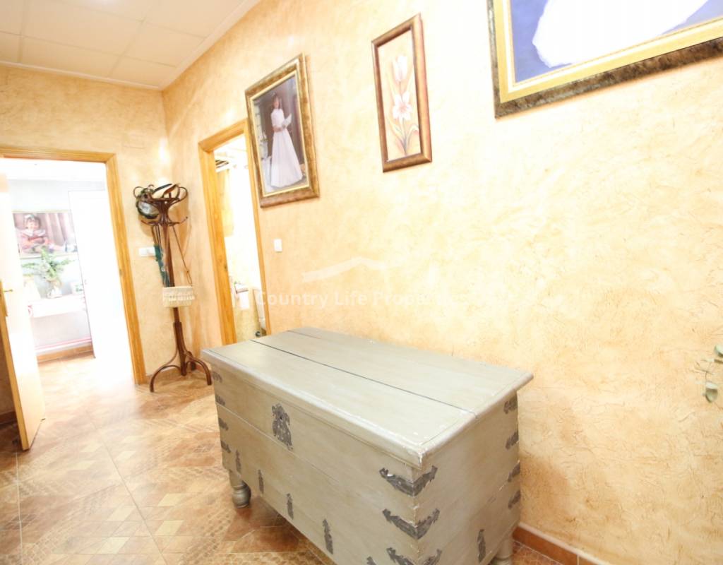 À l'intérieur, un séjour lumineux avec cheminée est relié à la cuisine par une arche. Une cuisine indépendante de bonne taille mène à une grande buanderie et espace de rangement, qui s'ouvre ensuite sur le patio et l'ancien poulailler désormais transformé en deux débarras.