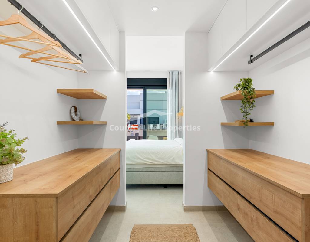 Op de eerste verdieping zijn er twee extra slaapkamers die een badkamer delen. Eén heeft een ingebouwde kast, de andere een inloopkast, en beide hebben directe toegang tot een privéterras. Een groot dakterras completeert de woning en biedt open uitzichten en extra buitenruimte.