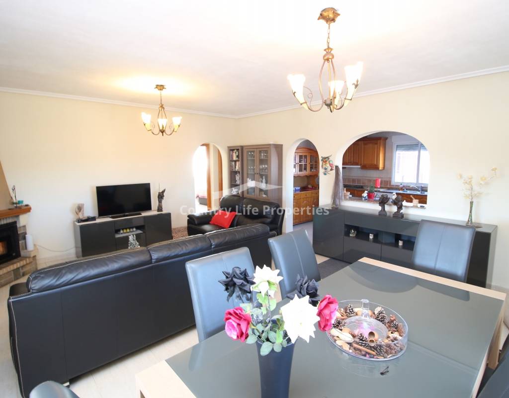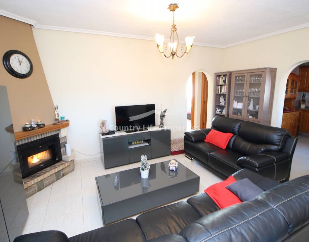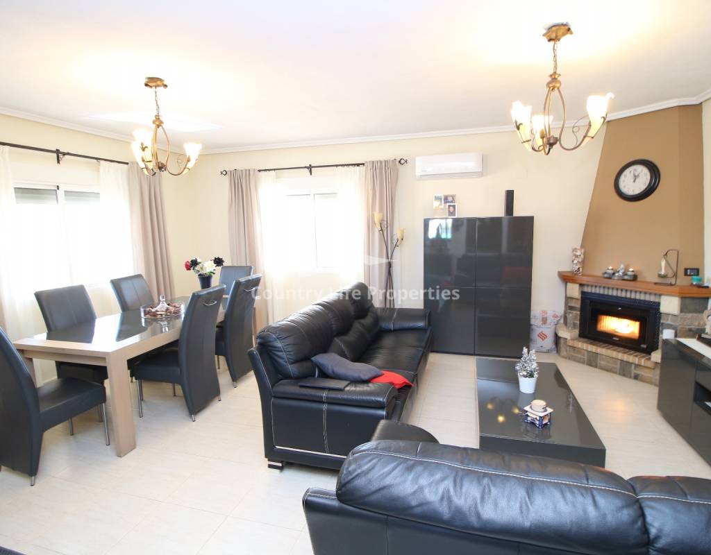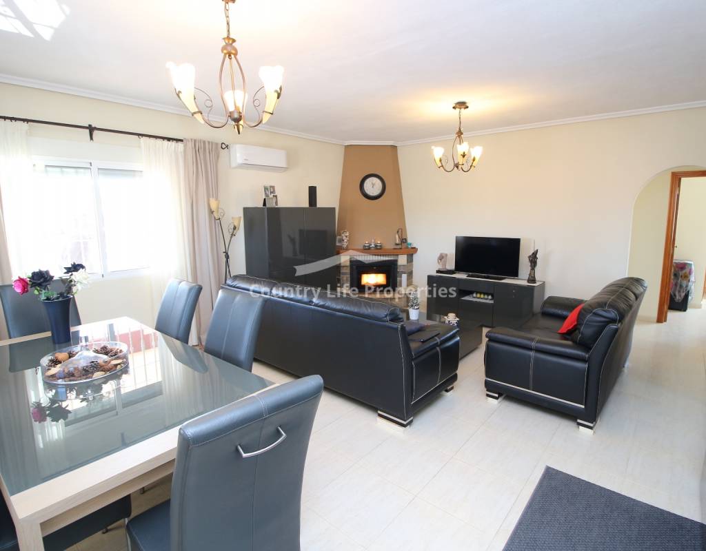 Binnen vindt u een zeer ruime woon- en eetkamer en een eethoek met een uitschuifbare tafel voor 6 personen. Er is recent geïnstalleerde airconditioning warm en koud in de eetruimte en een open haard met een inbouw pelletkachel.