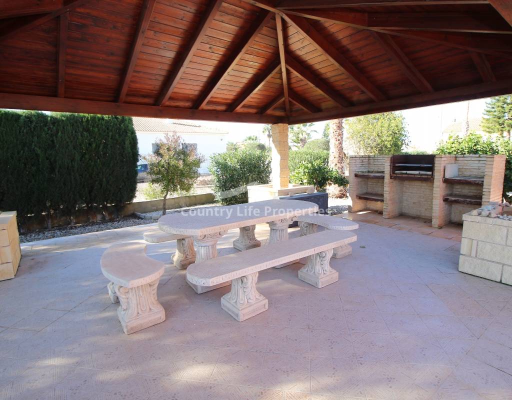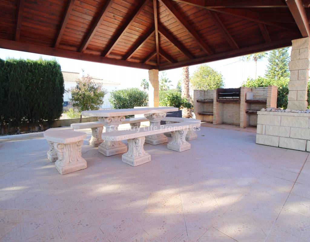 Buiten is er een perceel met een zwembad van 10x5 en meerdere schaduwrijke ontspanningsruimtes: een zeer grote pergola bij het zwembad met zomerkeuken, nog een grote pergola met een prachtig houten dak en barbecue, en een praktische pool house berging waar de zwembadpomp zich bevindt. Daarnaast is er een stevig gebouwde carport voor twee auto's. Drie zijden van het perceel zijn omheind met een muur en de vierde zijde met cipressen, wat veel privacy biedt. Als extra zijn er fruitbomen zoals sinaasappel, peer, appel en citroen.