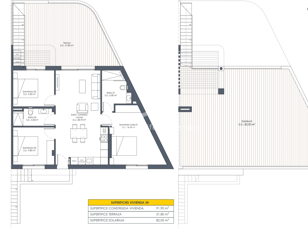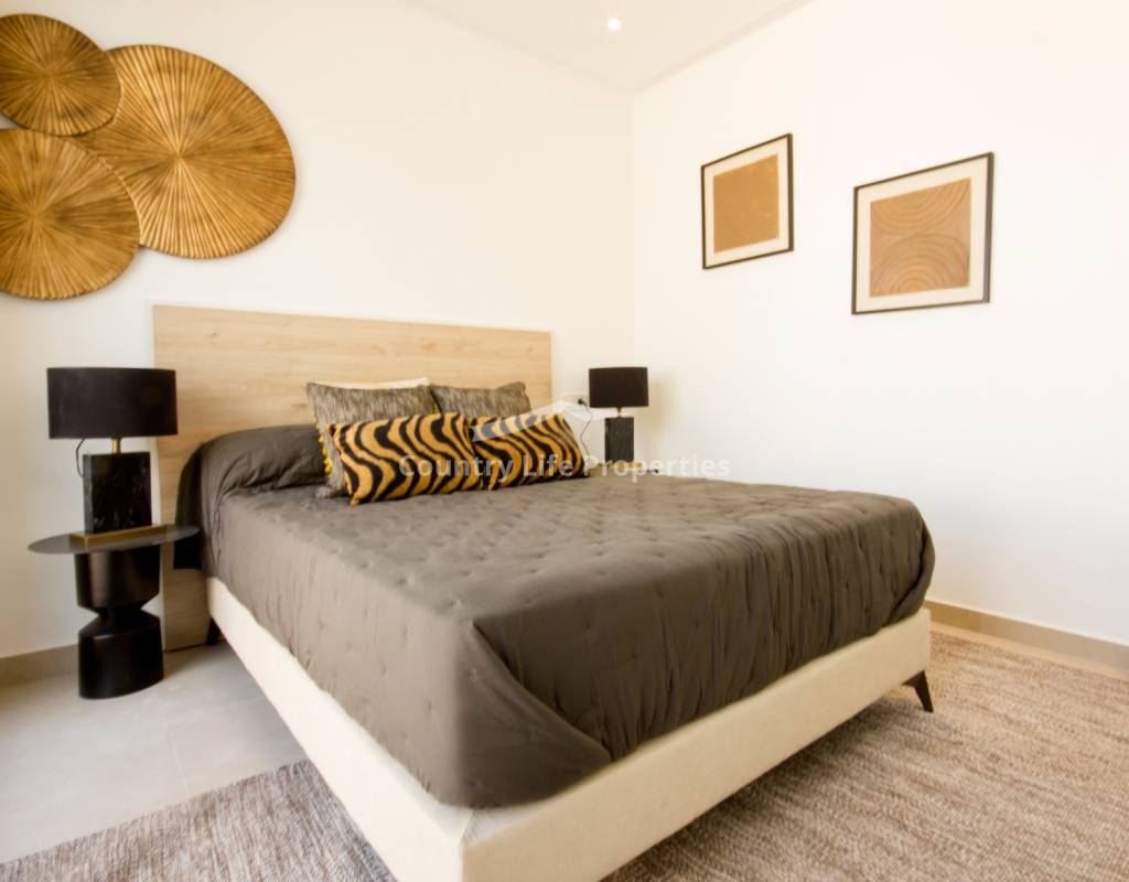 Er zijn drie slaapkamers, waarvan de hoofdslaapkamer een en-suite badkamer heeft. Daarnaast is er een tweede volledige badkamer, beide uitgerust met ROCA sanitair, inloopdouches en glazen wanden.