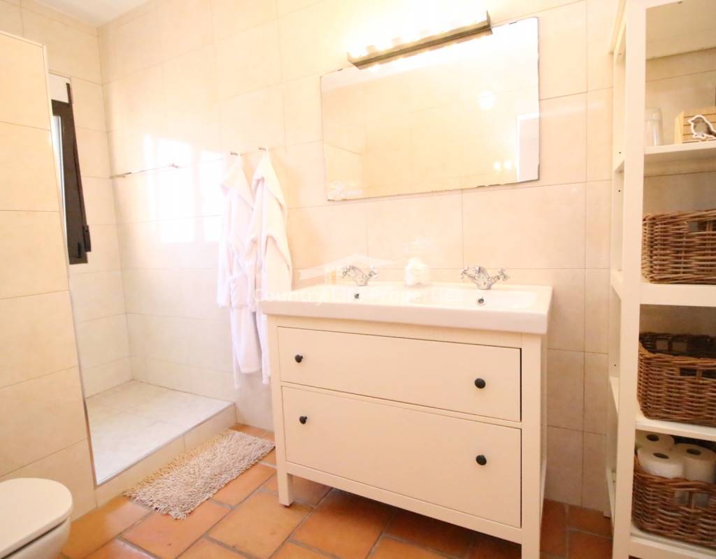 The main house is distributed over two floors and offers 3 bedrooms and 3 bathrooms, all en-suite. On the ground floor, there are two bedrooms with built-in wardrobes, each with its own bathroom, as well as an office room, a separate dressing room, and a practical laundry room. The property also features a separate living room and dining area, together with an independent kitchen with direct access to the exterior.