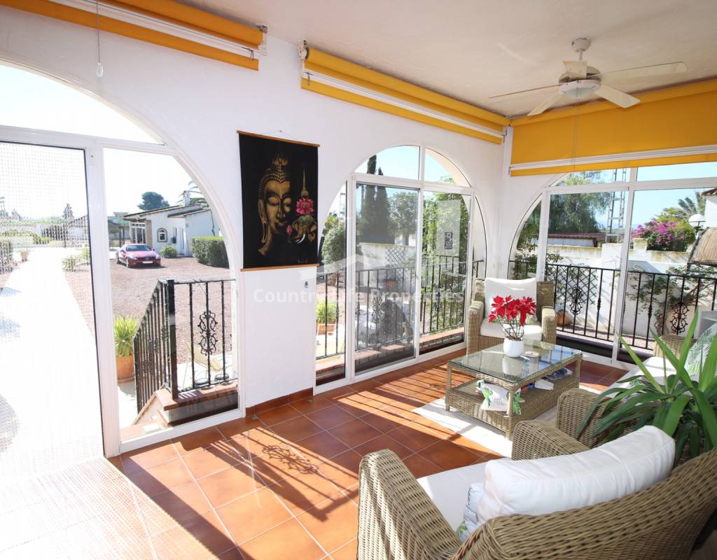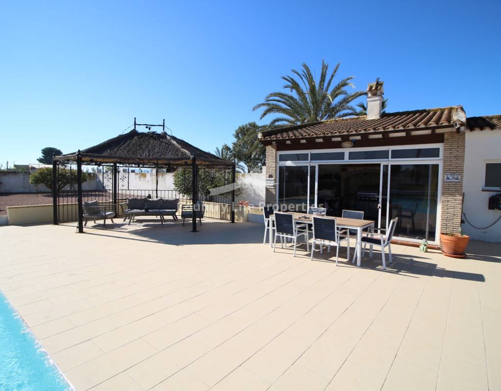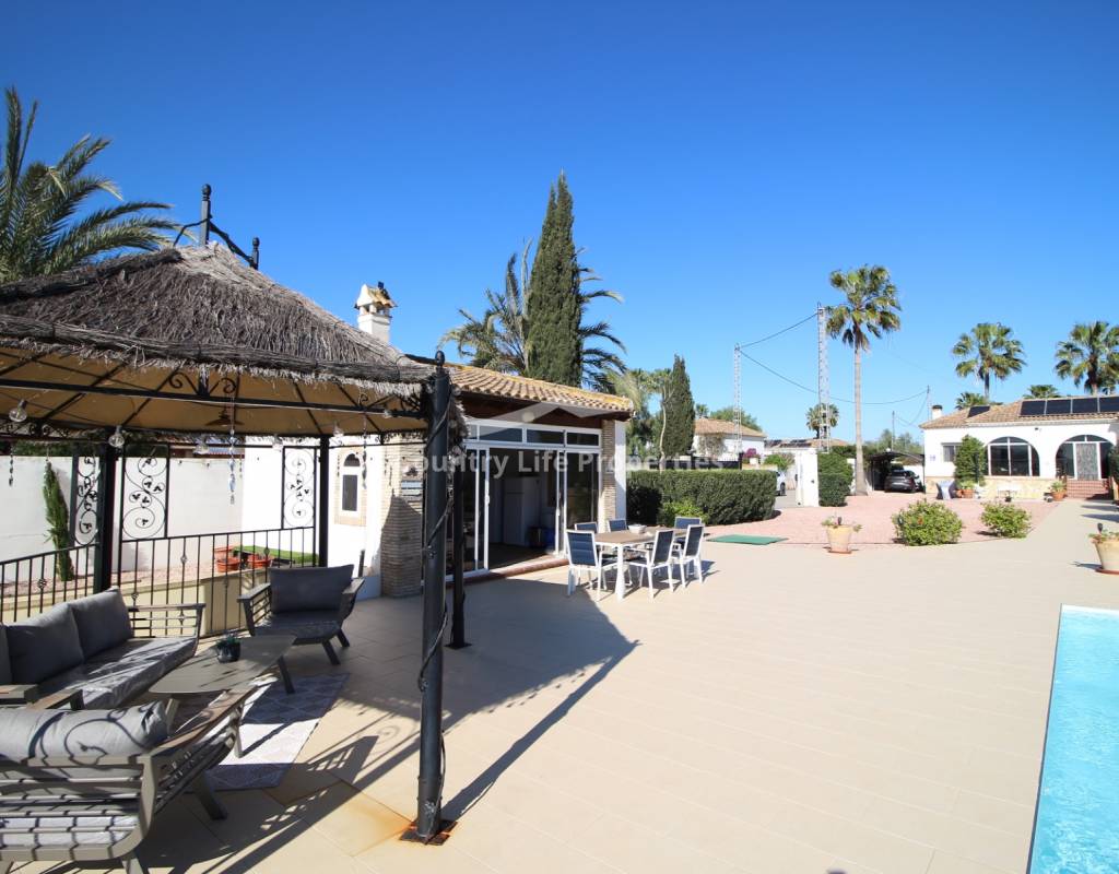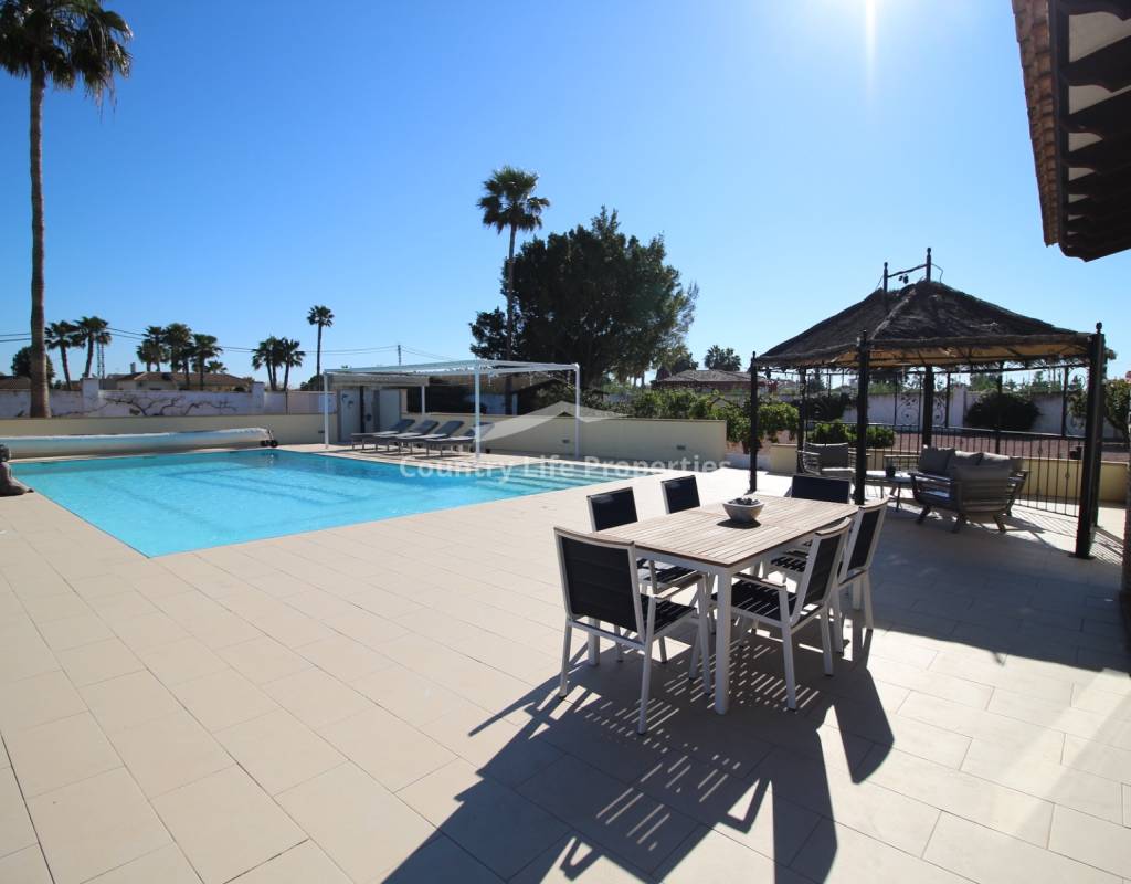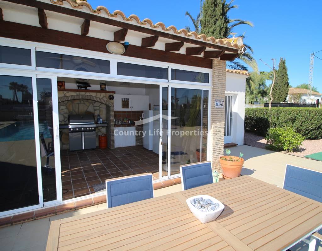 Снаружи участок включает фруктовые деревья, красивую перголу у бассейна и полностью оборудованную летнюю кухню, идеально подходящую для отдыха и приёма гостей. Бассейн оснащён системой солнечного подогрева, что позволяет пользоваться им дольше в течение года.